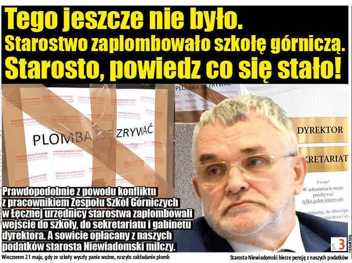 MAJ W czasie kontroli szkoły górniczej 21 maja zaplombowano wejście do budynku, a także drzwi sekretariatu i gabinetu dyrektora oraz pomieszczenia jednego z pracowników - W czasie mojego 16-letniego urzędowania na stanowisku burmistrza Łęcznej nie przypominam sobie, żeby coś takiego się wydarzyło – mówił radny Teodor Kosiarski. Starostwo swoje działanie tłumaczyło... względami bezpieczeństwa. W tle był konflikt z jednym z pracowników – urzędnicy utrzymywali m. in. że nie mogą otrzymać od niego dostępu do szkolnego monitoringu, czemu on zaprzeczał. Sprawa dla tego pracownika skończyła się zmianą pracy, przyjął ofertę z innej powiatowej placówki .