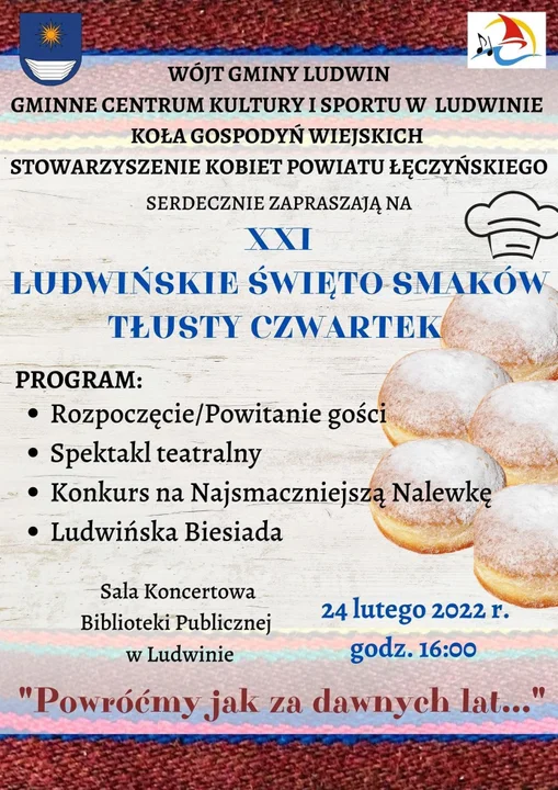 Informacje łęczyńskieSpektakl teatralny w wykonaniu młodzieży „W Kleszczach” przygotowany przez reżysera Jarosława Figurę, konkurs na najsmaczniejszą nalewkę i Ludwińska Biesiada – tak Ludwin świętuje Tłusty Czwartek. Początek imprezy o godz. 16 w bibliotece w Ludwinie.