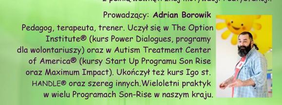 Adrian Borowik, absolwent Wydziału Pedagogiki UW, wieloletni wolontariusz, terapeuta z ogromnym doświadczeniem w pracy z osobami z autyzmem, który poprowadzi warsztaty pod nazwą „Zabawa Inspirująca Rozwój".