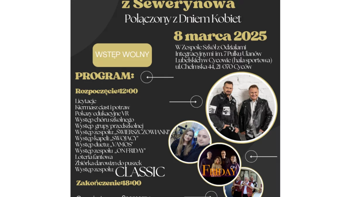Koncert rozpocznie się w sobotę 8 marca o godz. 12 w hali Zespołu Szkół w Cycowie. Wydarzenie będzie połączone z gminnymi obchodami Dnia Kobiet.