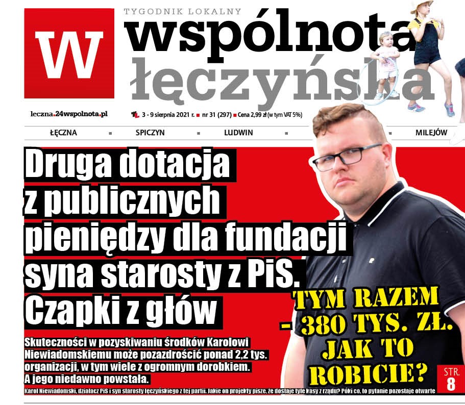 Nie dalej jak przed dwoma miesiącami informowaliśmy o przyznaniu 235,5 tys. zł publicznych pieniędzy Fundacji Rozwoju Powiatu Łęczyńskiego, założonej przez Karola Niewiadomskiego, lokalnego działacza PiS, syna starosty łęczyńskiego.