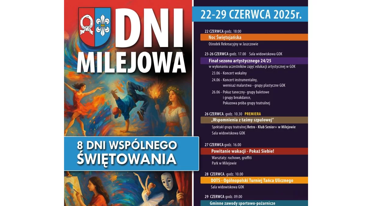 Przez osiem dni, od 22 do 29 czerwca, mieszkańcy Milejowa i okolic będą mogli uczestniczyć w niezwykłym święcie pełnym atrakcji dla każdej grupy wiekowej. Tegoroczna edycja Dni Milejowa zapowiada się wyjątkowo – z premierami teatralnymi, koncertami, warsztatami artystycznymi, turniejami oraz wielkim finałem sezonu artystycznego.