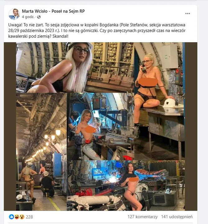 Przypomnijmy, że zdjęcia roznegliżowanych modelek pozujących na tle podziemnych korytarzy i pracujących spawaczy w ubiegły czwartek opublikowała posłanka Koalicji Obywatelskiej, Marta Wcisło.