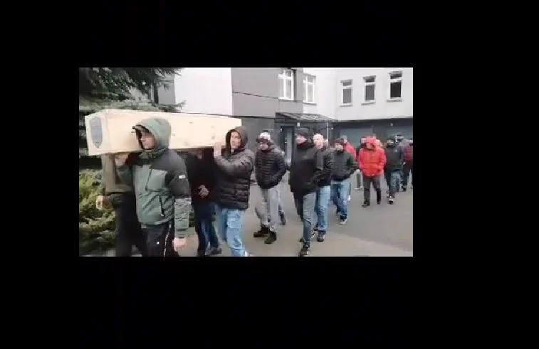 Czwartek, 5 grudnia, przy budynku zarządu Lubelskiego Węgla Bogdanka. Górnicy niosą trumnę z napisem "Enea zabija Bogdankę". W nietypowym marszu bierze udział około 20 osób, a na czele idzie Jarosław Niemiec, przewodniczący Związku Zawodowego "Przeróbka" działającego w LWB. Na końcu czterech górników ustawia trumnę przy schodach prowadzących do siedziby zarządu.