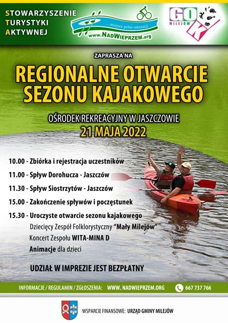 Informacje łęczyńskieStowarzyszenie Turystyki Aktywnej "Nad Wieprzem" zaprasza do Ośrodka Rekreacyjnego w Jaszczowie na Otwarcie Sezonu Kajakowego, które odbędzie się 21 maja. Szczegóły na plakacie.