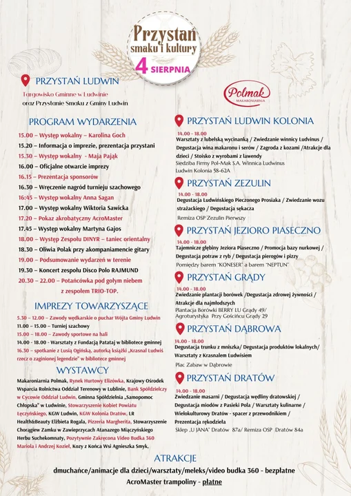 Informacje łęczyńskieGmina Ludwin słynie z chleba ludwińskiego i makaronu, ale też pieczonego prosiaka czy wędliny dratowskiej. Ludwińskich potraw tradycyjnych spróbujemy jutro (w niedzielę 4 sierpnia) na siedmiu przystaniach. A jako gwiazda wieczoru zagra gurpa disco polo Rajmund.