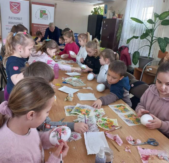 W dalszej części tygodnia działania przeniosły się do Gminnej Biblioteki Publicznej w Cycowie. Tam na uczestników czekały nie tylko literackie podróże między półkami, ale również warsztaty kulinarne. Dzieci samodzielnie przygotowywały i dekorowały gofry. Mali artyści projektowali unikalne, drewniane pisanki oraz stworzyli pamiątkowy plakat z odbiciami dłoni. Ważnym akcentem była wizyta pań z Koła Gospodyń Wiejskich w Cycowie, które podzieliły się swoim talentem, ucząc dzieci wykonywania wiosennych bocianów oraz tradycyjnych ozdób świątecznych.