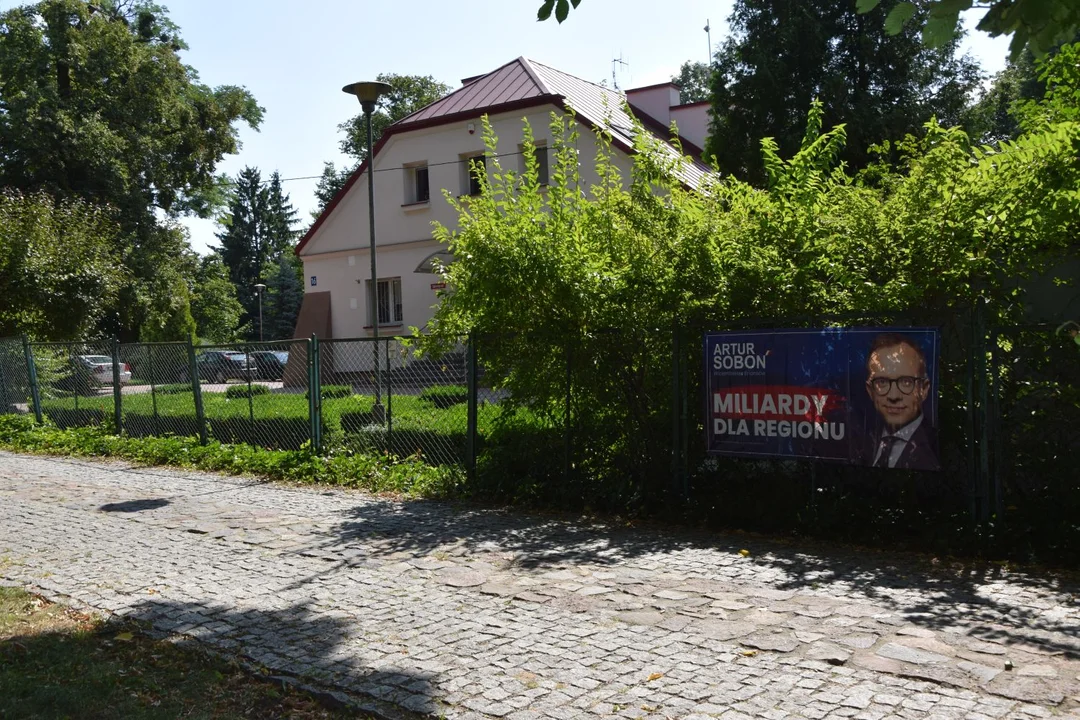 I rzeczywiście tak się stało: tamten baner zdjęto, ale już po tygodniu na tym samym ogrodzeniu pojawiło się... pięć nowych banerów z wizerunkiem Sobonia. Są zarówno od strony Parku Podzamcze, jak i przy drodze wojewódzkiej. Tych pięć nowych banerów ma mniejszy format od poprzedniego, ale łączy je to samo zdjęcie Sobonia i logo PiS w klapie jego marynarki.