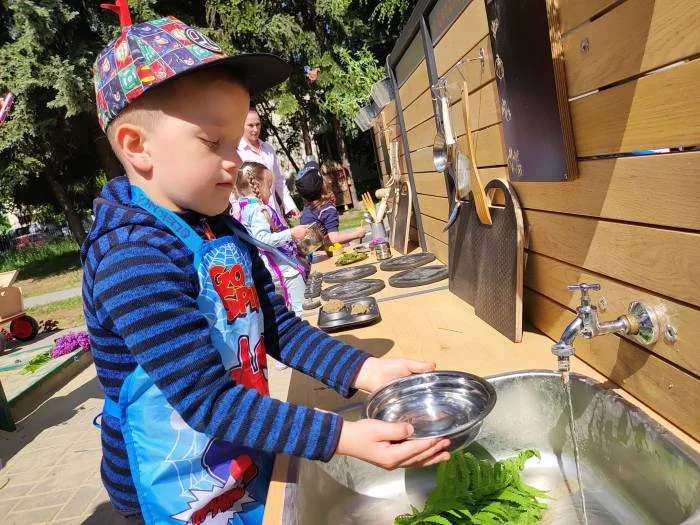 - W czasach pośpiechu, smartfonów i plastikowych zabawek zapominamy o dawnych zabawach zgodnych z naturą i wspomagających rozwój dzieci na świeżym powietrzu - wylicza Katarzyna Gańska, dyrektor PP nr 1 w Łęcznej - garnki wydają różne dźwięki, a produkty, których maluchy używają do przyrządzania potraw, mają różny zapach i konsystencję. Można dotykać błota, trawy i piasku, jest bieżąca woda.