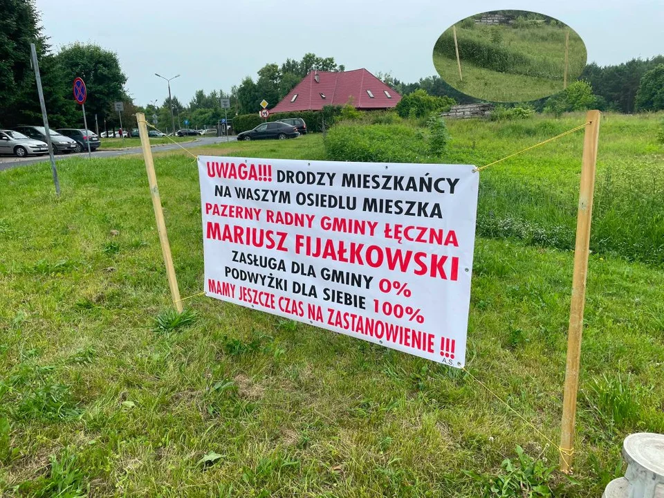 Na osiedlu Bobrowniki w okolicy ulicy Wiosennej i Leśnej stanęły dzisiaj dwa banery z tekstem: "Uwaga!!! Drodzy mieszkańcy, na waszym osiedlu mieszka pazerny radny gminy Łęczna Mariusz Fijałkowski. Zasługa dla gminy 0%, podwyżki dla siebie 100%. Mamy jeszcze czas na zastanowienie!!!".