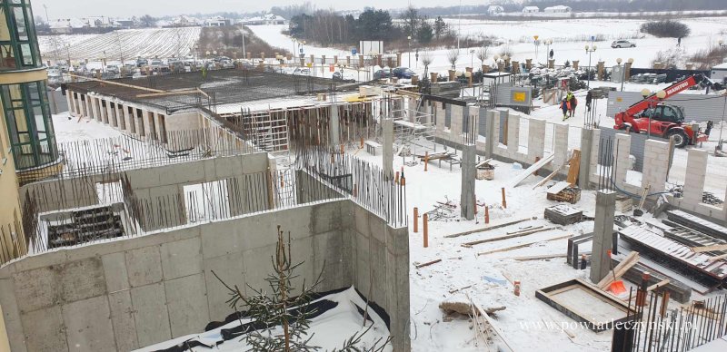 Zarys budynku jest już widoczny, bo z ziemi wyrosły nie tylko fundamenty, ale pojawiły się też ściany zewnętrzne. Prace ziemne udało się wykonać przed nadejściem mrozu i śniegu. By budowa obiektu mogła się rozpocząć wykonawca musiał przenieść sieć gazową i sieć ciepła technologicznego, która znajdowała się w obszarze inwestycji. Pozostałe przyłącza zostaną wykonane w kolejnym etapie budowy, a teraz, jeśli zima pozwoli - zostaną wylane stropy nad pierwszą kondygnacją.