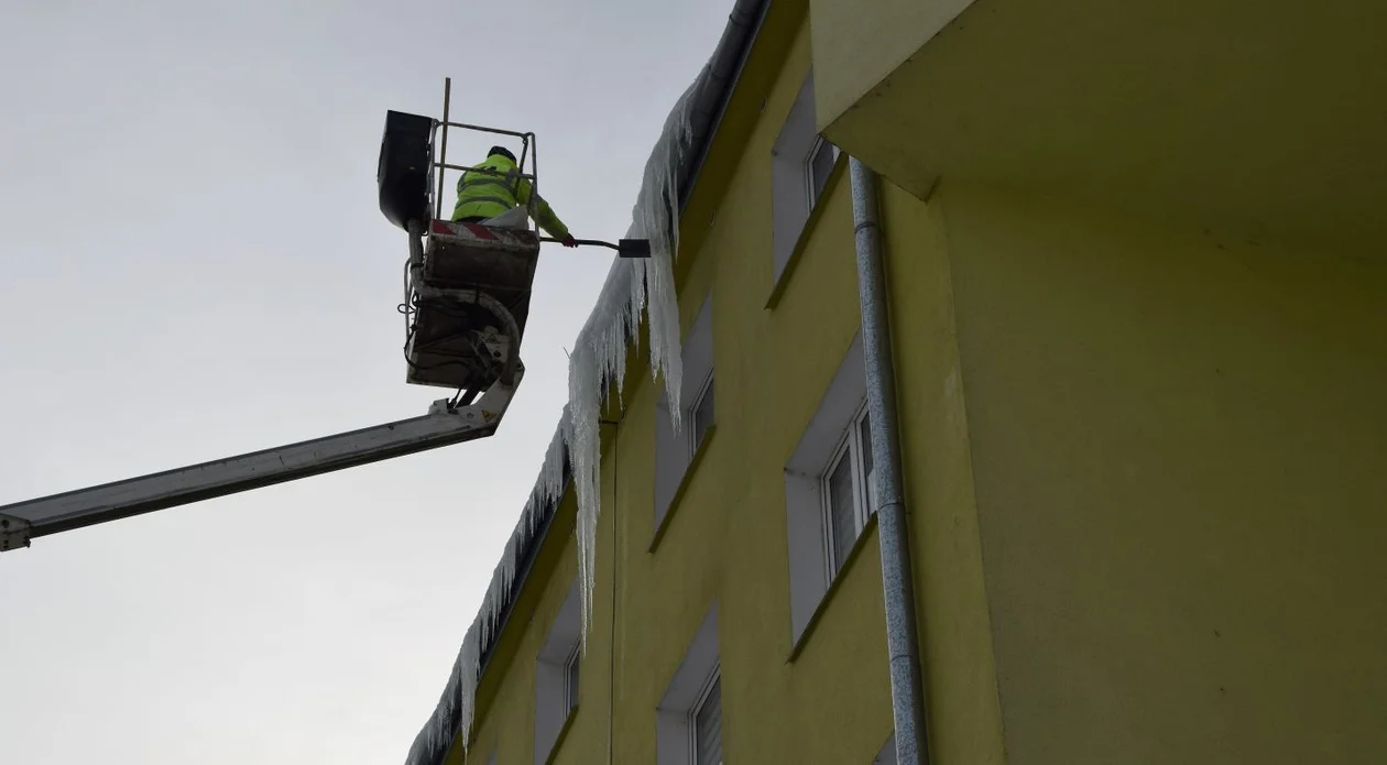 Robotnicy usuwają zatem ogromne sople łopatami i tyczkami. A największe tworzą się na blokach z dachami jednospadowymi, jak na przykład przy ulicy Obrońców Pokoju 5. Sytuacje utrudnia też to, że dach tego budynku nie jest podgrzewany jak tych znajdujących się naprzeciwko, przy ul. Obrońców Pokoju. Właśnie tam spotkaliśmy dzisiaj robotników, którzy podjechali pod budynek samochodem z wysięgnikiem i usuwali ciężkie sople.