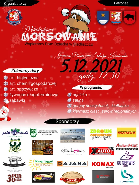 W ostatni dzień zbiórki, w niedzielę, 5 grudnia Morsy z Corsy zapraszają na Mikołajkowe Morsowanie, które odbędzie się na plaży od strony leśniczówki (w google maps wystarczy wpisać „plaża Kaniwola”).
