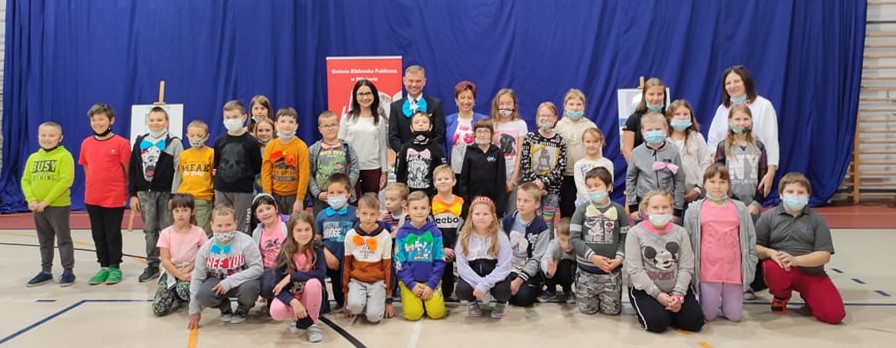 Spotkanie z pilotem było nie lada gratką nie tylko dla uczniów, ale także nauczycielek i bibliotekarek obecnych na spotkaniu, które miało miejsce 30 września. Również Marcin Modrzewski otrzymał od uczniów dużą niebieską kokardę na Dzień Chłopaka |