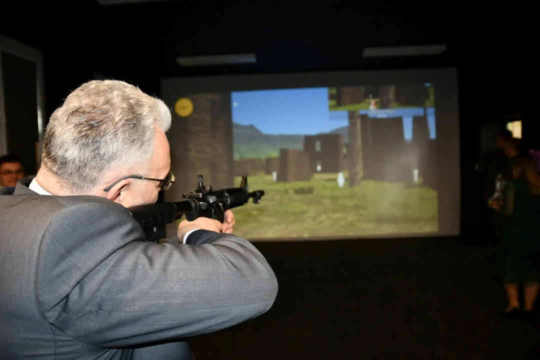 A na otwarciu wirtualnej strzelnicy za pistolety i karabiny chwycili nie tylko uczniowie, ale też m. in. wiceminister finansów Artur Soboń, starosta Krzysztof Niewiadomski i przewodniczący Rady Powiatu Łęczyńskiego Arkadiusz Biegaj.