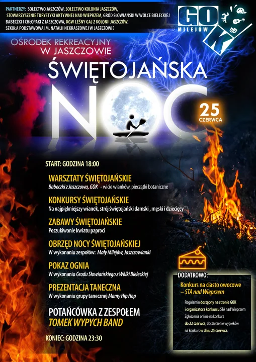 W programie także obrzęd nocy świętojańskiej w wykonaniu zespołu Mały Milejów, pokaz ognia, prezentacja taneczna, a na koniec potańcówka z zespołem Tomek Wypych Band.