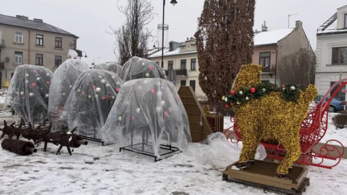 Na wykonanej w piątek fotografii widać zaawansowane prace porządkowe. Elementy dekoracyjne zostały starannie zabezpieczone folią ochronną, aby zapobiec ich zniszczeniu podczas transportu i przechowywania. Obok zabezpieczonych mniejszych choinek na placu wciąż widoczne są charakterystyczne figury reniferów i sań, które również zostaną.