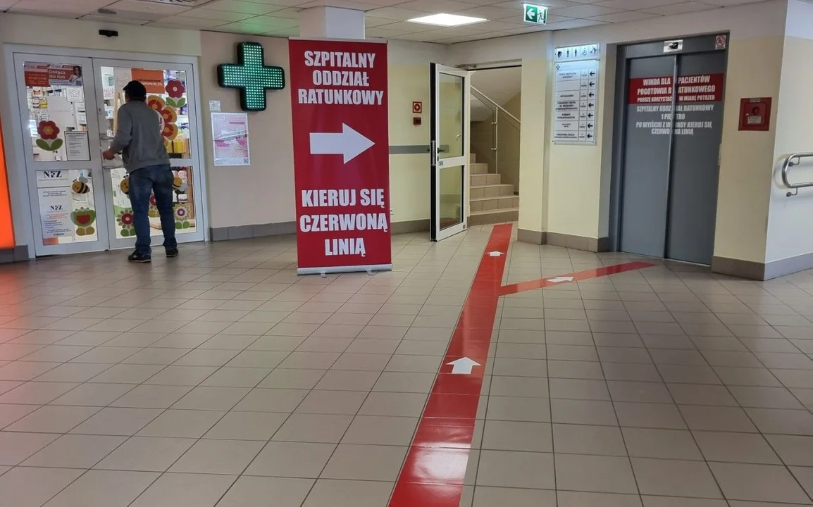 W poniedziałek, 15 maja zmieni się sposób poruszania wewnątrz łęczyńskiego szpitala. Przez najbliższe miesiące do Szpitalnego Oddziału Ratunkowego droga będzie prowadziła przez główne wejście budynku. Informują o tym plakaty, strzałki i naklejki, a kieruje czerwona linia.
