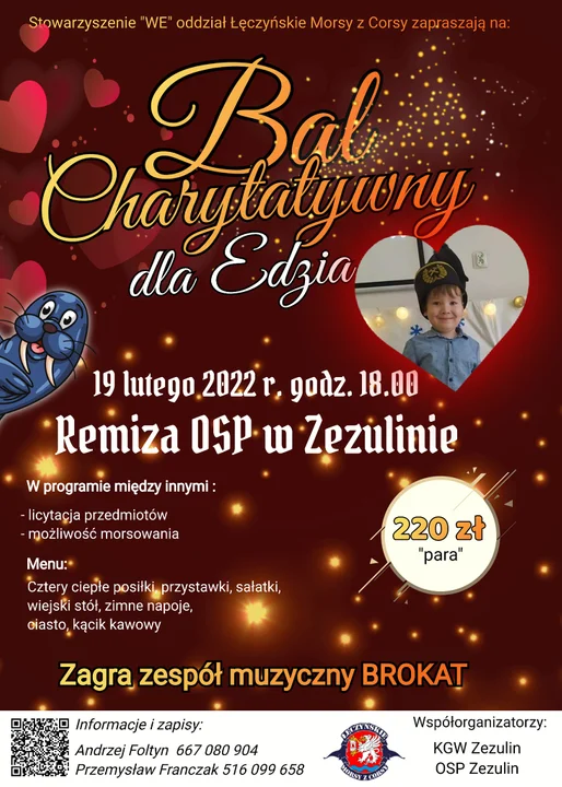 W cenie wejściówki (220 zł od pary) organizatorzy oferują dania gorące, przystawki i napoje oraz zabawę z zespołem Brokat. W czasie imprezy odbędą się także licytacje dla Edzia.