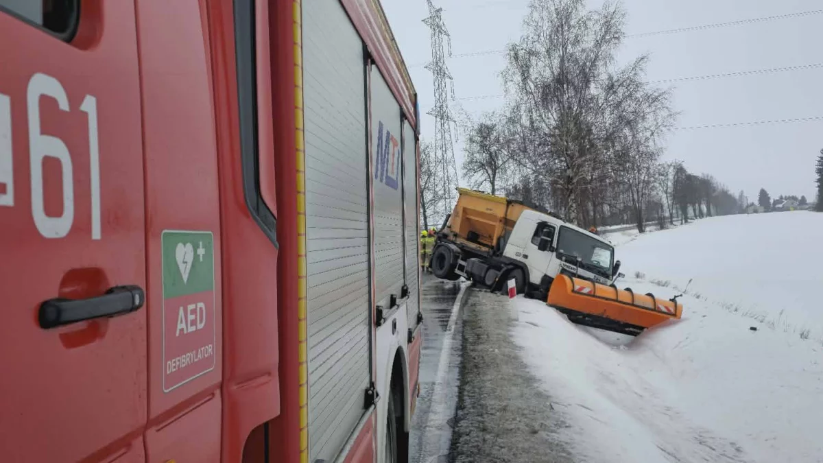 Pojazd, w wyniku oblodzonej nawierzchni, zsunął się z jezdni do przydrożnego rowu.