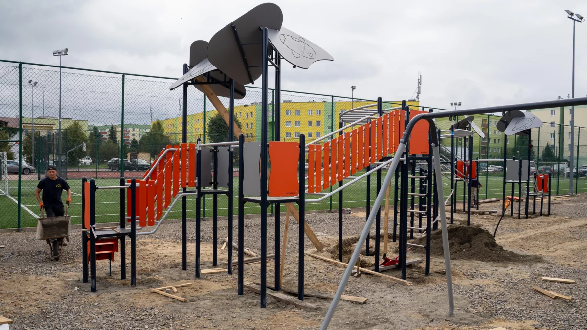 Prace są opóźnione, ale mocno zaawansowane. Konstrukcje placu zabaw są stawiane, a siłownia zostanie zamontowana za kilka dni.