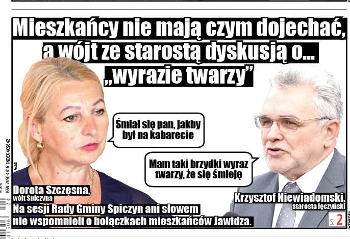 Na sesji w Spiczynie obecny był starosta Niewiadomski i członek zarządu powiatu Michał Woźniak. Między starostą i wójt doszło do ostrej wymiany zdań, a w kulminacyjnym momencie dyskusji wójt Szczęsna stwierdziła, że starosta śmieje się jak na kabarecie. Niewiadomski na to odpowiedział: - Pani wójt, mam taki brzydki wyraz twarzy, że się śmieję, ale pierwszy raz się spotkałem, żeby ktoś mi zwrócił uwagę jak ja wyglądam.