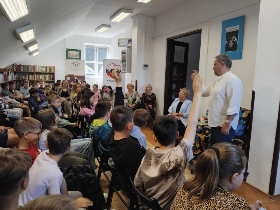 Grzegorz Kasdepke z pasją opowiadał o kulisach pisania, inspiracjach i bohaterach swoich książek, z którymi dzieci często się identyfikują. Młodzi słuchacze chętnie zadawali pytania – od zabawnych po zaskakująco dojrzałe – a autor odpowiadał z humorem i życzliwością, nawiązując świetny kontakt z publicznością.