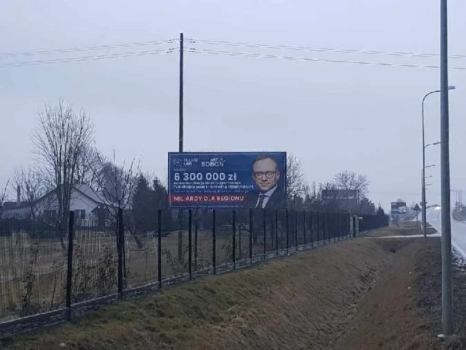 Przypomnijmy, że o tych banerach pisaliśmy już kilkakrotnie. Jest na nich napis "Artur Soboń", a poniżej kwota dotacji i informacja, na co została przeznaczona. Do tego symbol "Polski Ład" i hasło "Miliardy dla regionu".
