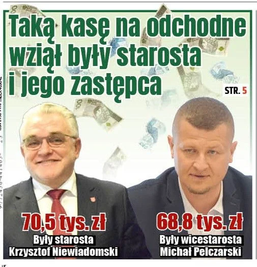 Z kolei były wicestarosta Michał Pelczarski dostał odprawę w wysokości 49.775 zł, a do tego ekwiwalent za 13 dni niewykorzystanego urlopu przysługującego za 2023 rok i 11 dni za 2024 rok w łącznej kwocie 19.034 zł.