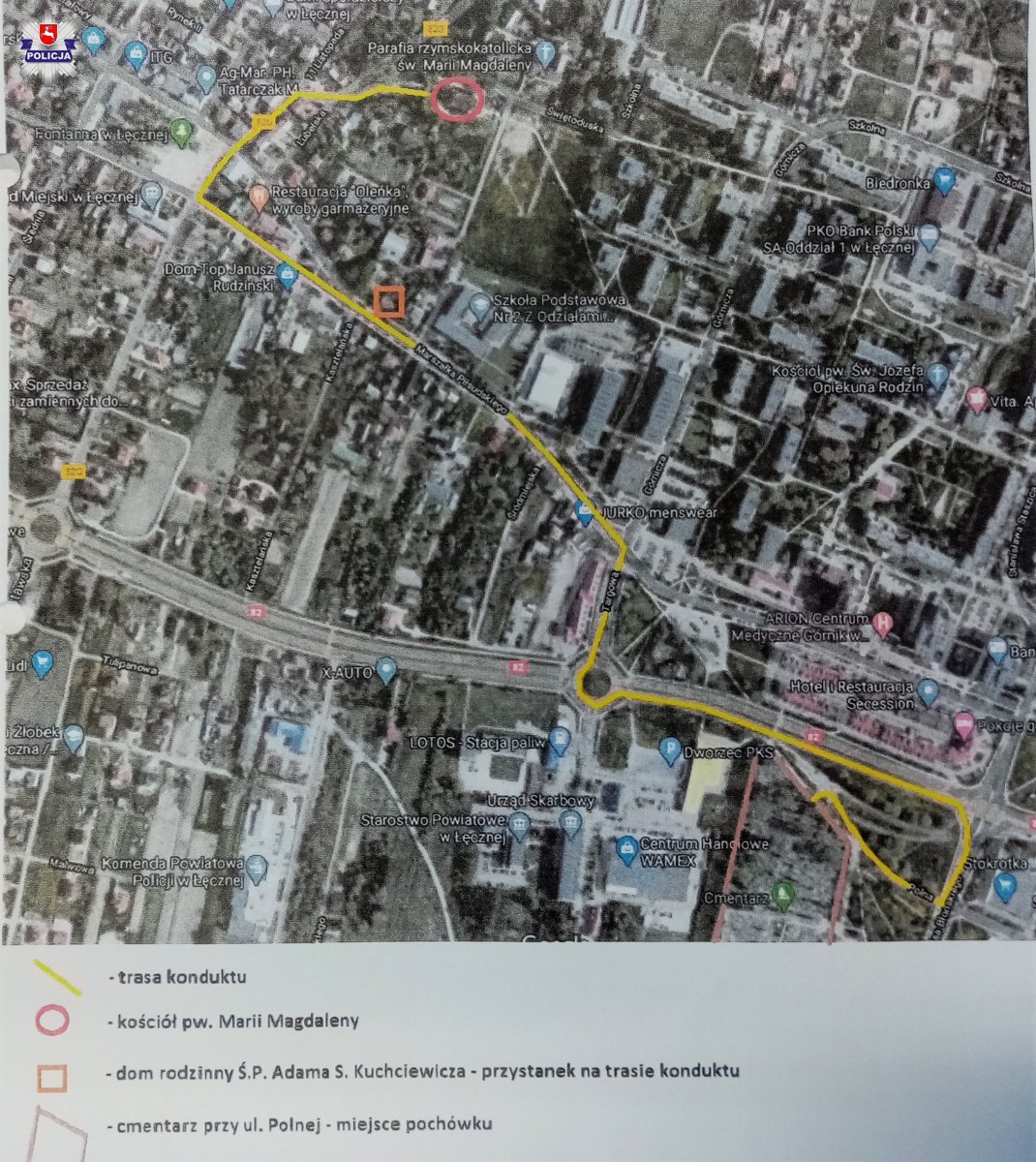 Łęczyńscy policjanci wraz z żołnierzami żandarmerii wojskowej będą zabezpieczać trasę przejazdu konduktu pogrzebowego z kościoła pw. Św. Marii Magdaleny ulicą Świętoduską, ulicą Lubelską, ulicą Marszałka Piłsudskiego, ulicą Górniczą, DK numer 82 na cmentarz przy ulicy Polnej (poniżej mapka).