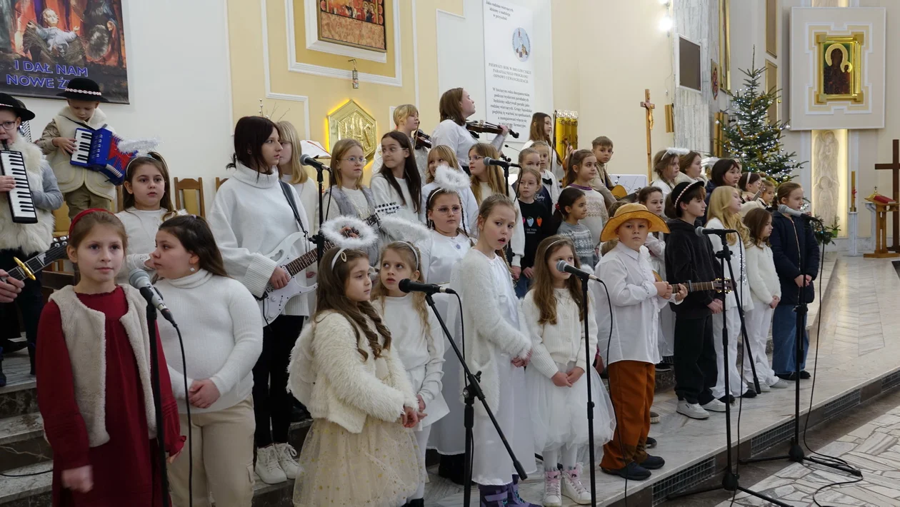 Dzieci i młodzież śpiewały i grały kolędy przed wczorajszą (5 stycznia) mszą św. o godz. 11.30, przygotowały oprawę muzyczną mszy św., wystąpiły także z koncertem kolęd tuż po niej. Usłyszeć można było znane kolędy i pastorałki, które dzieci i młodzież zaśpiewała i zagrała na gitarach, ukulele, perkusji, instrumentach klawiszowych, akordeonach (z ks. Pawłem Gawrońskim), dzwonkach, gongu, skrzypcach i melodykach.