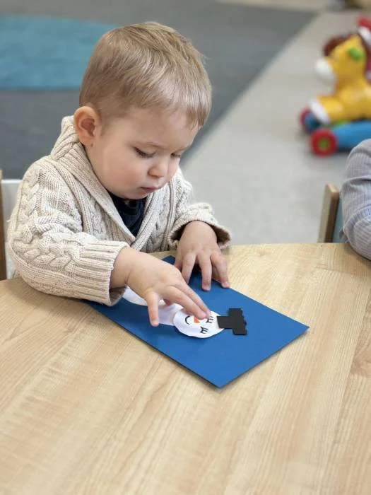 Najmłodsi wzięli udział w pracy plastycznej, podczas której wykonywali bałwanki, przyklejając papierowe koła na kartki.