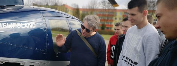 Robinson R44 to czteromiejscowy lekki helikopter, napędzany jest jak corvette jednym, sześciocylindrowym silnikiem, tłumaczył pilot. Młodzież dowiedziała się, że silnik śmigłowca wyposażony jest w podwójny iskrownik, żeby tłok zawsze dostał iskrę, niezależnie od tego pod jakim kątem się znajduje.