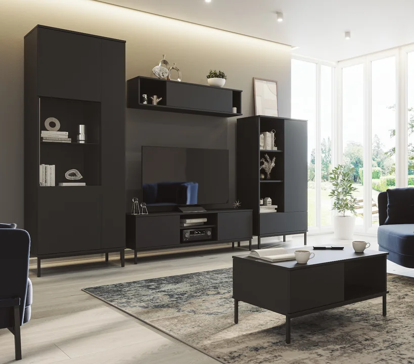 W sklepie internetowym Mebline.pl znajdziesz szeroki wybór regałów w różnych stylach, wielkościach i wariantach kolorystycznych. Oferujemy modele nowoczesne oraz klasyczne, zainspirowane stylem skandynawskim, loftowym czy też minimalistycznym. Jedną z propozycji jest prosty regał QUERTY z półkami (otwartymi i zamykanymi) oraz pojemną szufladą u dołu, w której przechowamy mnóstwo drobiazgów. Elegancki czarny mat doskonale wpasuje się w aktualne trendy wnętrzarskie. Mebel wykonano z mocnej płyty meblowej. Metalowe nogi zaopatrzono w ślizgi. Regał jest ustawny, dzięki czemu sprawdzi się w każdym salonie nie zajmując wiele miejsca. Minimalistyczne wzornictwo, precyzja wykonania oraz funkcjonalność, to tylko niektóre zalety tego modelu. W kolekcji QUERTY znaleźć można również inne elementy systemu, w tym m.in. komody, szafki RTV, ławy kawowe, półki oraz przeszklone witryny.