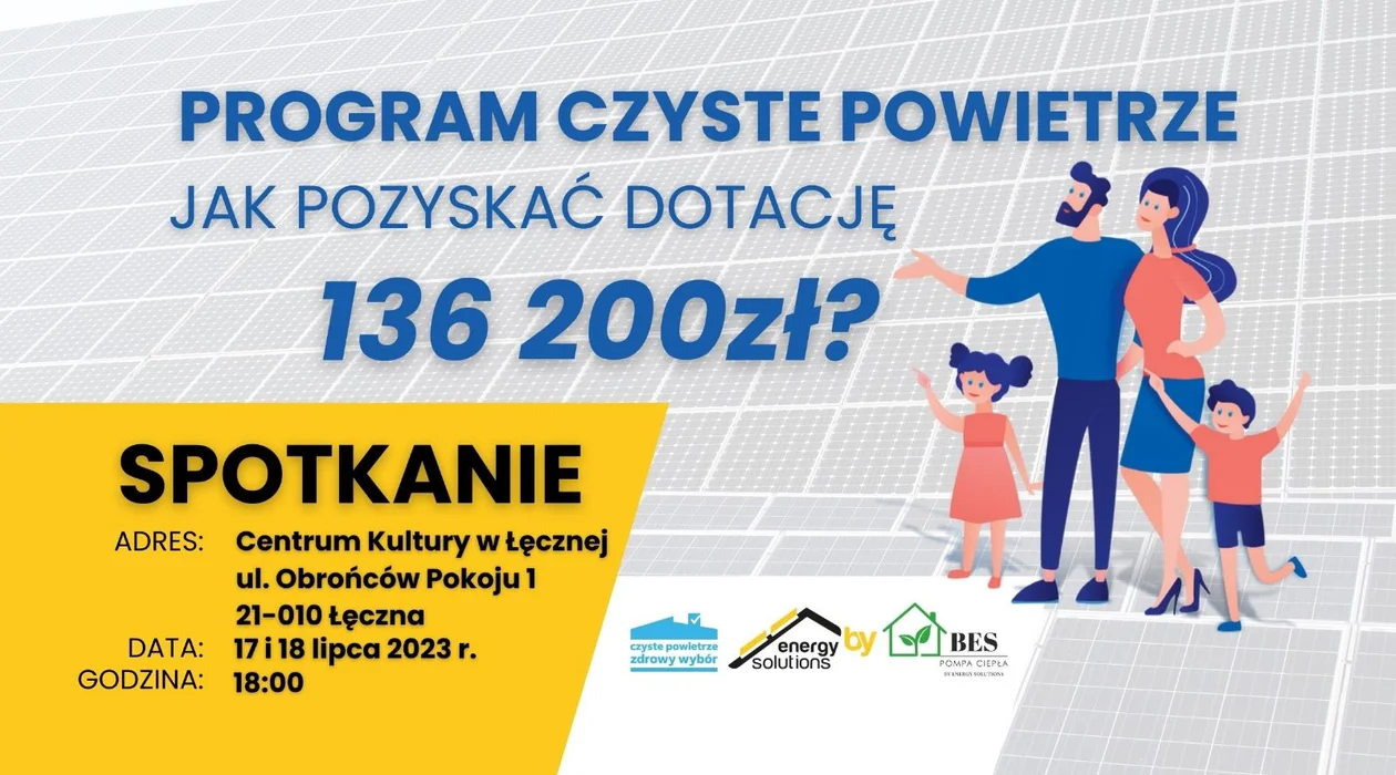 Generalny wykonawca zaprasza osoby zainteresowane dofinansowaniem w ramach programu „Czyste Powietrze” na spotkanie informacyjne. Spotkanie odbędzie się w poniedziałek i wtorek 17 i 18 lipca 2023 r. o godzinie 18.00 w Centrum Kultury w Łęcznej, ul. Obrońców Pokoju 1, 21-010 Łęczna.