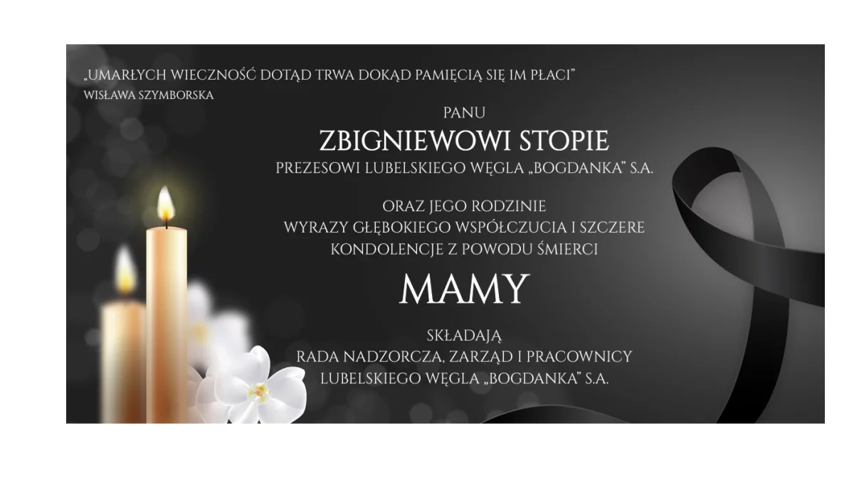 Kondolencje dla Prezesa Zbigniewa Stopy od Rady Nadzorczej, Zarządu i Pracowników LW Bogdanka