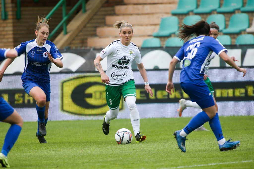 Do przerwy goli nie było, choć obie drużyny miały swoje okazje bramkowe. Łodzianki trafiły w poprzeczkę, a w ekipie gospodyń pojedynki z bramkarką rywala przegrały Roksana Ratajczyk i Nikola Karczewska.