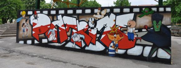 Miasto wytypowało ścianę i zapewniło materiały. Projektem i jego wykonaniem zajęli się graficiarze, którzy odmalowali bajkowe postacie. Na ścianie amfiteatru zobaczymy między innymi Bolka i Lolka, Reksia, Żwirka i Muchomorka. Całość zamknięta jest na filmowej taśmie. Na muralu przeczytamy łacińskie słowo „patriae" oznaczające ojczyznę.