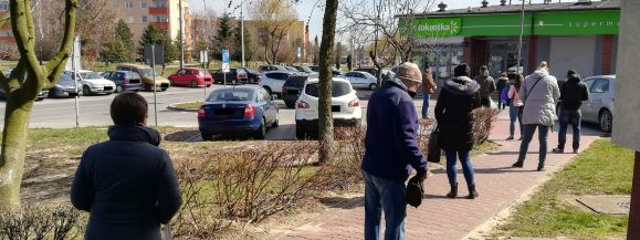 WiadomościCzekałam jakieś 15 minut. W kolejce na zewnątrz przede mną naliczyłam dziesięć osób – powiedziała nam klientka Stokrotki przy ul. Wierzbowej, która była już przed samymi drzwiami sklepu. Zdjęcia tej kolejki zrobiliśmy dzisiaj przed godz. 13. Kolejki są efektem nowych ograniczeń w związku z koronawirusem: do środka może wejść tylko trzy osoby na jedną kasę. Przypomnijmy, że ten limit na pocztach jest zmniejszony do dwóch osób na jedno okienko. W godz. 10-12 apteki i sklepy są otwarte tylko dla osób powyżej 65 roku życia. Należy też pamiętać o rękawiczkach, które zakładamy przed wejściem do sklepu.