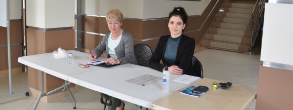 Panie siedzące przy stole mają przy sobie płyn antybakteryjny, - Odkażamy na bieżąco m. in. klamki do drzwi wejściowych, klawiaturę PIN pad na terminalu płatniczym – zapewnia rzecznik ratusza.