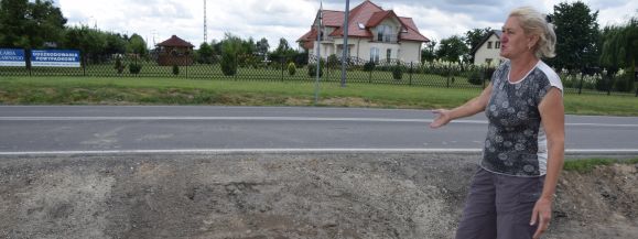 Jedną z osób pozbawionych wjazdu jest sołtys Starej Wsi Krystyna Tomczak, która wskazuje nam jak wygląda chodnik w miejscu, gdzie wcześniej był dojazd na jej pole porosłe zbożem.