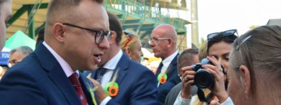 Rzeczywiście Artur Soboń był wszędzie. Na oklejonym samochodzie, na scenie i na placu dożynkowym, gdzie za posłem dzielącym się bochnami podążali młodzi ludzie wręczający obdzielonym chlebem wyborczą broszurę Sobonia.