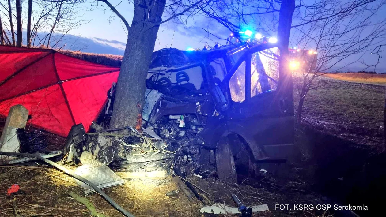 Autor: KSRG OSP Serokomla | Opis: Wjechał do rowu i uderzył w drzewo. Zginął na miejscu