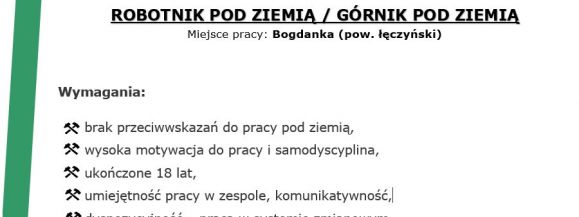 WiadomościPrzedsiębiorstwo Robót Specjalistycznych „WSCHÓD” S.A. zatrudni do pracy pod ziemią w kopalni węgla kamiennego: Lubelski Węgiel „BOGDANKA” S.A.