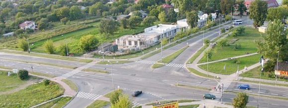 Rok 2005. Czego nie widać? Ani dzika i ronda, których jeszcze nie ma, ani tego, że dwupasmówka kończy się ok. 200 m za skrzyżowaniem, przechodząc w jedno pasmo drogi. Dopiero wznosi się pasaż handlowy. Na końcu ulicy, przy której jest budowany, widać autobus, wyjeżdżający ze starego przystanku. Bo nie ma jeszcze dworca autobusowego na terenie z wydeptaną trawą (prawa dolna część zdjęcia)