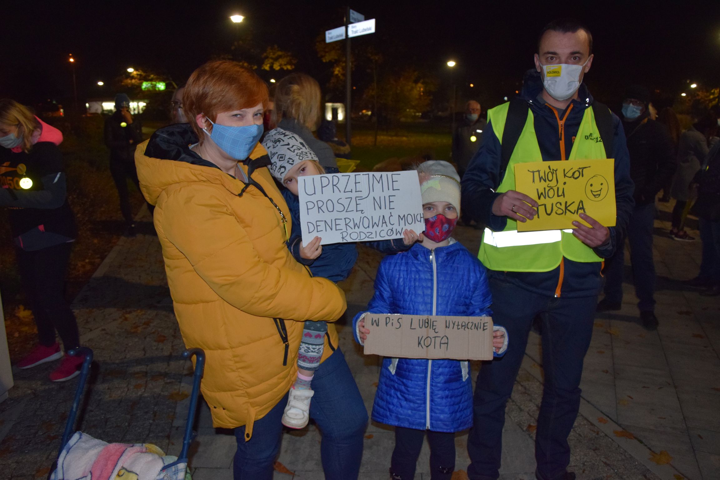 Razem z dziećmi spacerowały małe dzieci. Protestujący skandowali m. in. antyrządowe hasła. Mieli ze sobą transparenty, np. "W PiS lubię wyłącznie kota", "Twój kot woli Tuska", "Nie jestem za aborcją, jestem za wolnością" cszy "Wolność wyboru zamiast terroru".