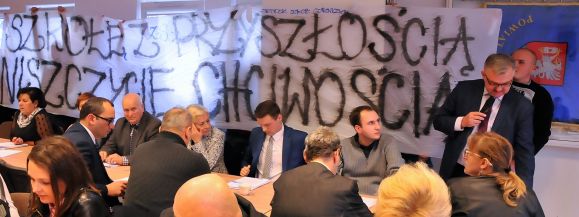 Na sesję przyszło około 55 uczniów szkoły górniczej i Jagiellończyka. Wzięli ze sobą transparenty. "Szkołę z przyszłością niszczycie chciwością" - napisali uczniowie górniczej, na drugim widniał napis: „Nie odbierajcie nam Jagiellończyka”.