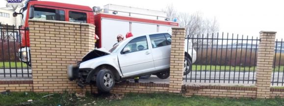 W wyniku siły uderzenia osobówka staranowała przęsła ogrodzenia kopalni, a następnie zatrzymała się na murze.