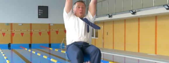 Burmistrz Łęcznej Leszek Włodarski postanowił w nietypowy sposób otworzyć basen po remoncie. Wskoczył do basenu w garniturze.