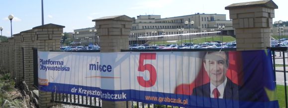 Kierowcy jadący ulicą Krasnystawską w stronę Milejowa widzą twarz polityka PO i górną część banera wystającą nad zbożem rosnącym obok ogrodzenia. Reklama wisi tuż obok wjazdu do szpitala.